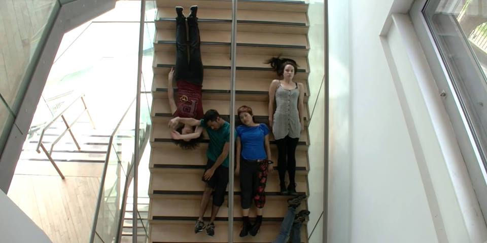 Dancers in weightless collapse on a series of endless stairways, where the performing body meets the architecture of culture.