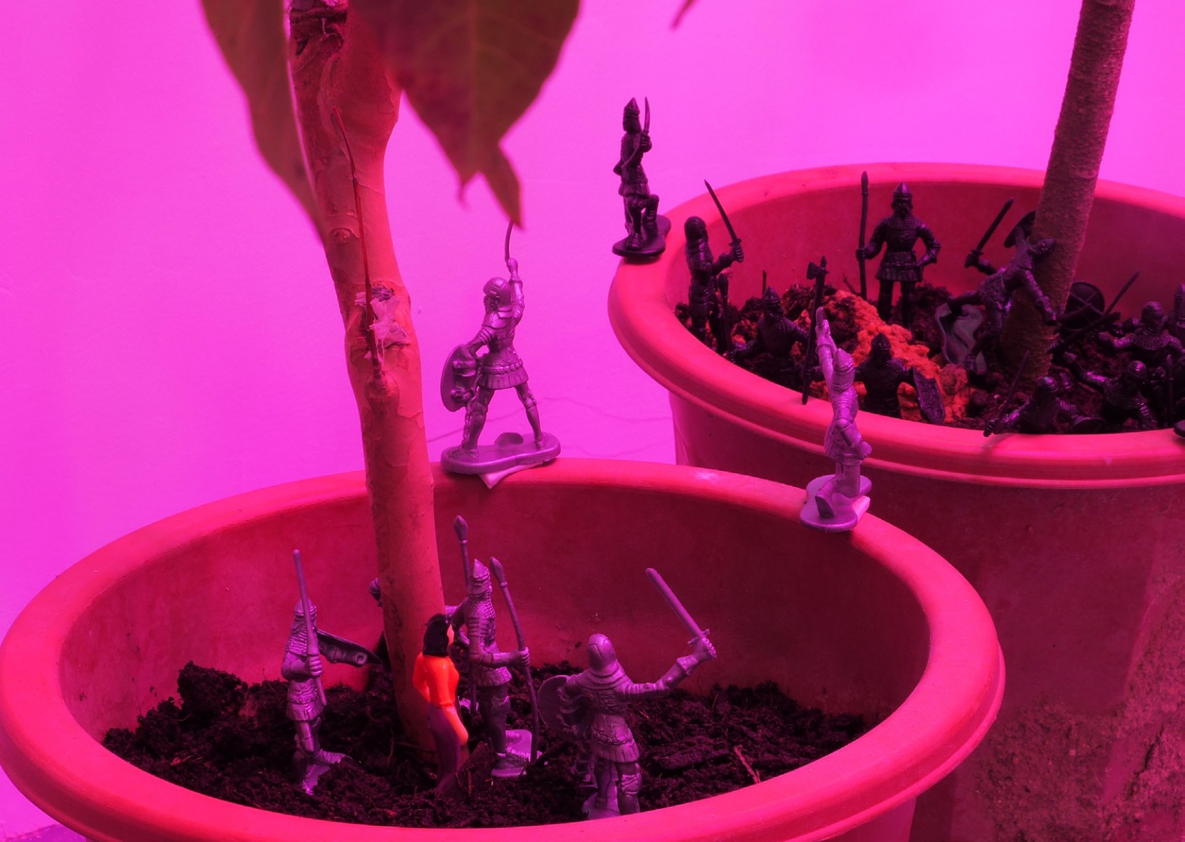 Materials: Tree Saplings, Toys, Clay, UV Lights, Photographs, Printed Documents, Tree Branches, Leaves, Tree Root, Video
