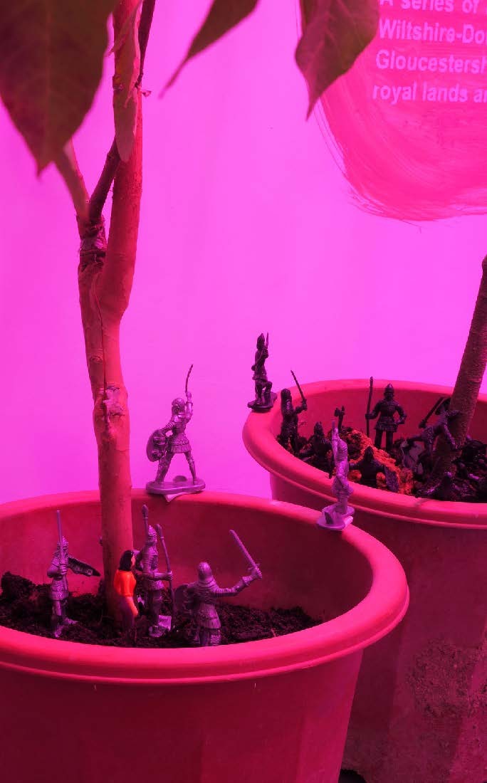 Materials: Tree Saplings, Toys, Clay, UV Lights, Photographs, Printed Documents, Tree Branches, Leaves, Tree Root, Video