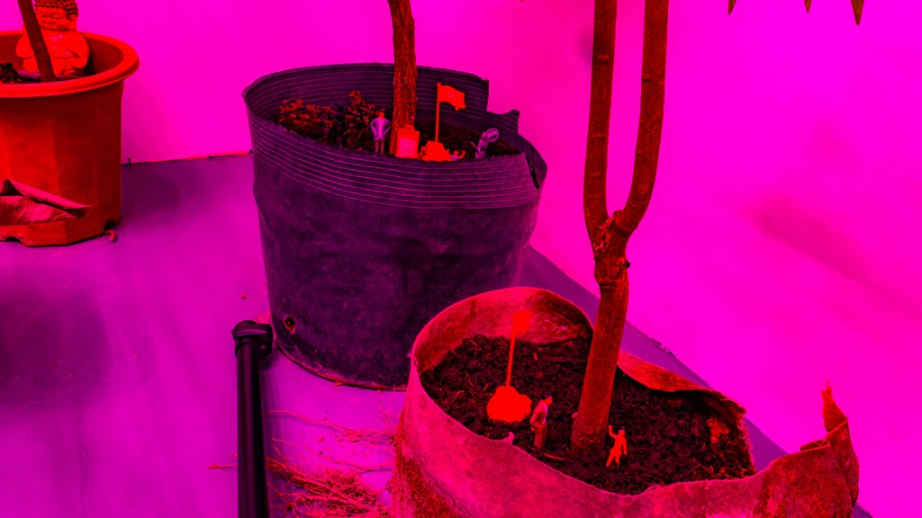 Materials: Tree Saplings, Toys, Clay, UV Lights, Photographs, Printed Documents, Tree Branches, Leaves, Tree Root, Video